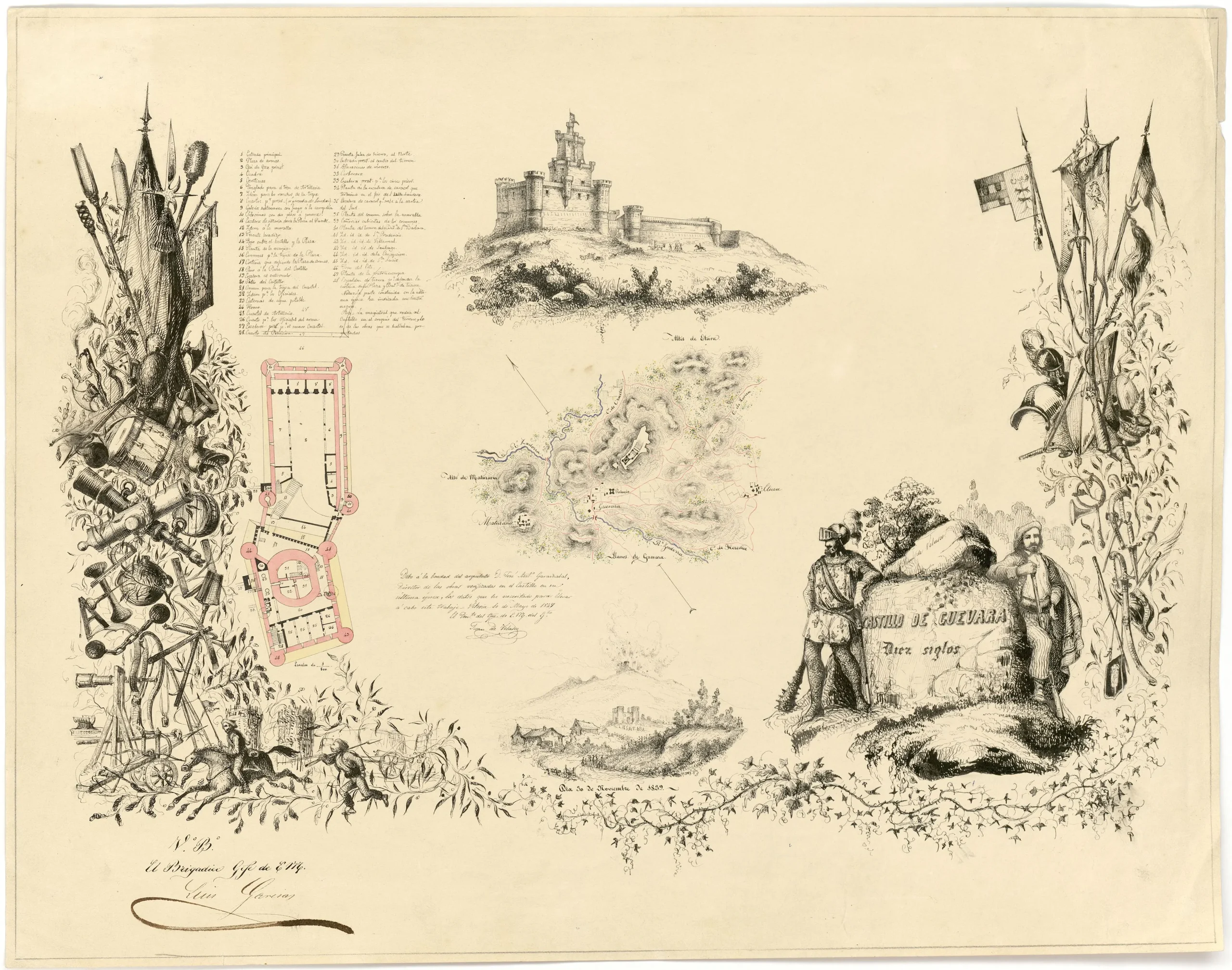 «Las dos de la tarde del 30 anterior era la hora designada para volar el torreón central del Castillo de Guevara y las miradas de la mayor parte de los vecinos de Vitoria y de los pueblos comarcanos, estaban fijas en el viejo alcázar, solar y cuna de los Ladrón de Guevara. Su blancura resaltaba sobre el fondo oscuro de las peñas de San Adrián, y dominando majestuosamente la llanada parecía por opinión, que sentado en el banquillo esperaba impávido y sin remordimientos la descarga de muerte. Las dos habían dado y se notaba alguna impaciencia; cuando al momento «suena un grito de admiración y todos los ojos se clavan en el enorme torreón; pero una densa nube de humo lo ocultaba á la vista, y cuando el viento lo fue disipando poco a poco el famoso Castillo de Guevara no era ya más que un montón de informes escombros».